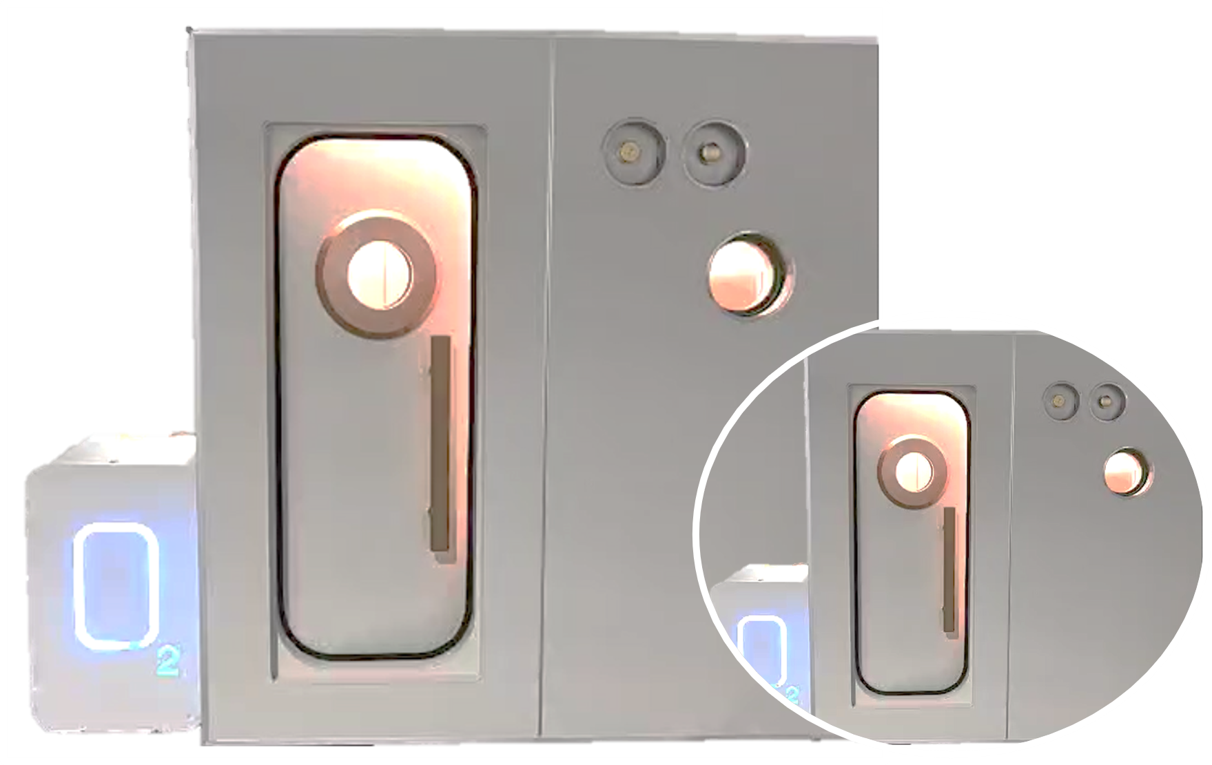 CE and ISO13485 approved. Chambers are made with 3,0 +- 0,2mm thickness with a PC Solid plate door that has a thickness of 10,5+-0,2mm. Internal upholstery is grey-white leather. 98% pure oxygen delivered via cannula mask with an 80 litre per minute oxygen setting. Cabin temperature is 16 to 30 degrees Celsius controlled by air conditioning. Internal and external safety pressure valves and takes approximately 2 Minutes to reach pressure and 10 seconds to reach back to 0 KPA.